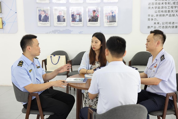 在重庆市亚特蓝电器有限责任公司,开州区税务人员和市场监督管理局工作人员共同解答招标投标及纳税信用方面问题。赵诗琦摄