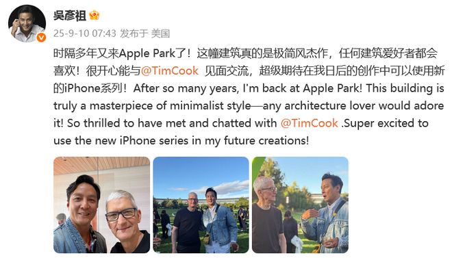 吴彦祖晒出3张和库克的合照写道:“时隔多年又来Apple Park了!这幢建筑真的是极简风杰作,任何建筑爱好者都会喜欢!很开心能与@TimCook 见面交流,超级期待在我日后的创作中可以使用新的iPhone系列!”