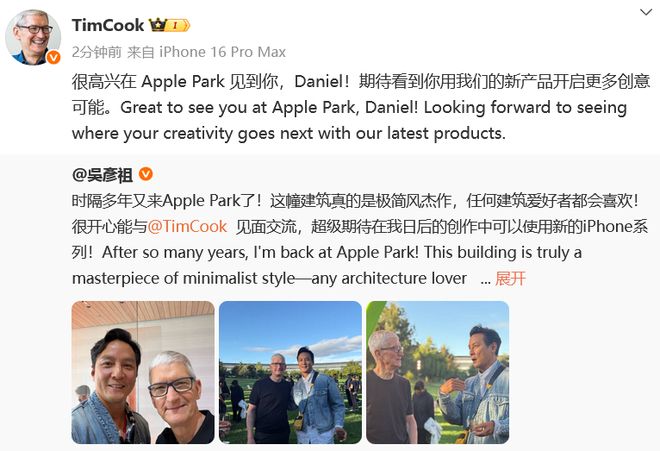 随后,库克转发吴彦祖微博回应:“很高兴在 Apple Park 见到你,Daniel!期待看到你用我们的新产品开启更多创意可能。”