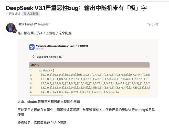 日前,DeepSeek 最新版 V3.1 被多名开发者实测发现,会在完全不该出现的地方插入「极 / 極 / extreme」等 token。
