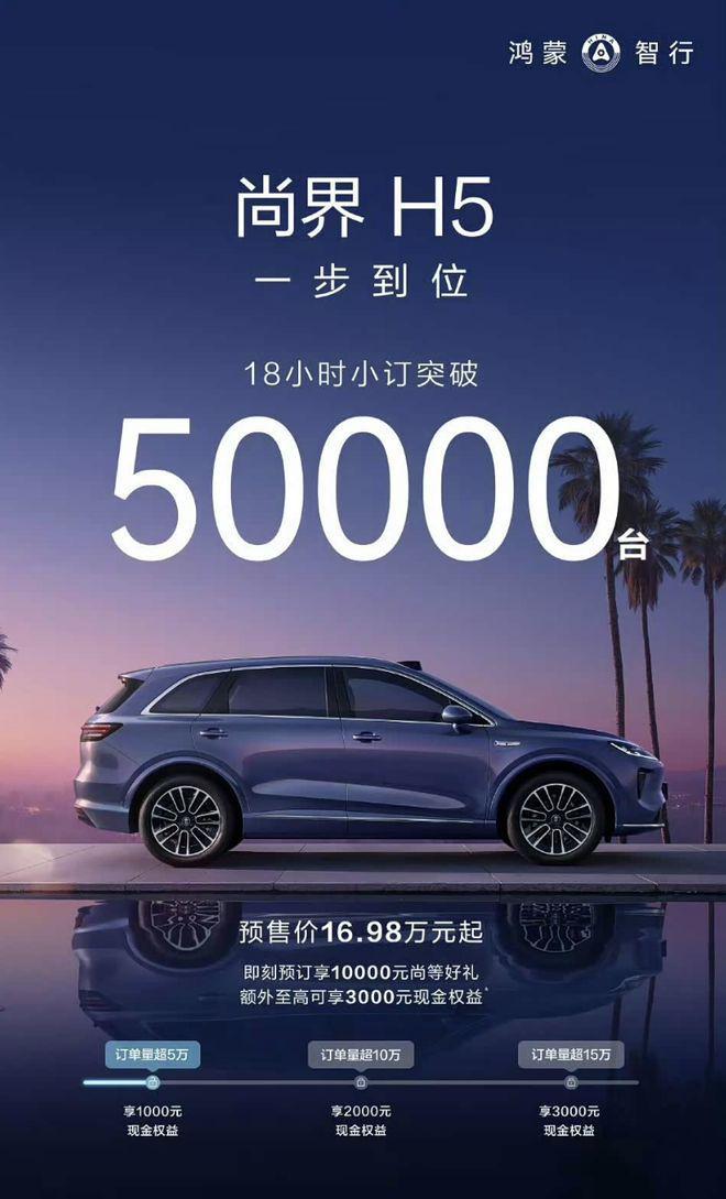 昨日,鸿蒙智行的尚界 H5 开启预售,预售价 16.98 万元起。预售开启后 1 小时,新车收到了超 2.5 万张小订。