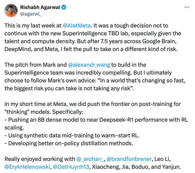 而据了解,Rishabh 在 Meta 中和团队折腾出了不少成果,比如推动了在「思考型」模型在后训练方面的进展;通过 RL 扩展,将一个 80 亿参数的稠密模型推到了接近 Deepseek-R1 的性能。