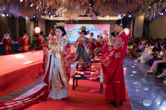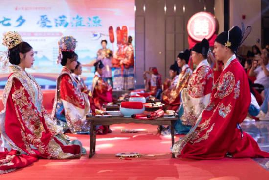 8月29日,农历七月初七,是中国传统节日七夕佳节。当天上午,“情定七夕·爱满淮源”2025年推进移风易俗、倡树文明新风集体汉婚仪式在河南省南阳市桐柏县盘古大酒店隆重举行。12对新人身着明制婚服,依古礼、行婚典,在庄重典雅的仪式中许下相守一生的誓言,以极具中华传统文化魅力的方式,共同谱写了一场浪漫隽永的“中式”婚礼篇章。
