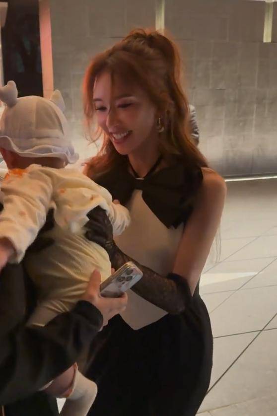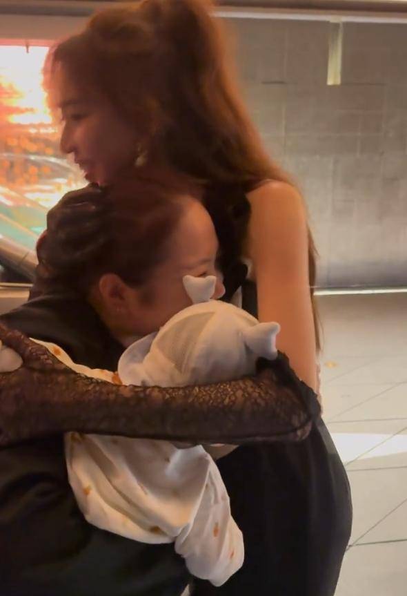 她下车后见到有人怀抱婴儿,立刻走上前主动索抱,举止间透露出浓厚的日本式礼仪感。得到同意后,她温柔地将宝宝接过,眼神中充满母性光辉。